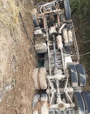 記者趕到現(xiàn)場從很遠地方就可以看到一輛攪拌車橫躺在渠中,零部件散落一地,攪拌車有不同程度的受損。