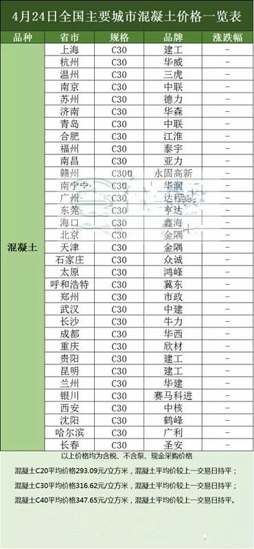 砼商網(wǎng)資源分享,4月24日全國(guó)主要城市水泥、混凝土、價(jià)格表。