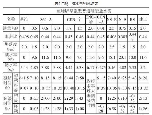 分別準(zhǔn)確稱取水泥300g、減水劑300g及水300g,按規(guī)范方法,將水、減水劑及水泥凈漿進(jìn)行拌和。在干凈的玻璃上將拌和好的水泥講講裝入試模中,將試模逐次提起后,對水泥凈漿的流動情況進(jìn)行觀察,并對水泥凈漿的流動性能進(jìn)行測試,看其能否滿足混凝土泵送要求。同時(shí),對不同的水泥、不同的減水及減水率大小及摻量進(jìn)行記錄,然后優(yōu)選,如表1所示。