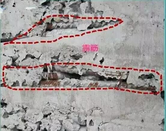 在鋼筋混凝土澆筑過程中振搗不到位,保護(hù)層墊塊沒有設(shè)置或者固定不牢固,混凝土坍落度小,或拆模早,混凝土硬化前受外力導(dǎo)致剝落而使構(gòu)件成型后鋼筋外露的現(xiàn)象。