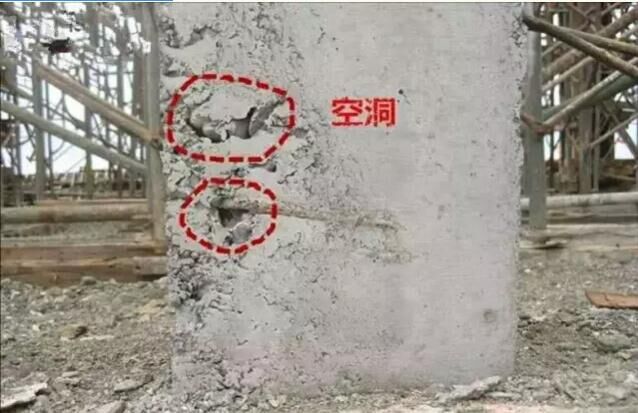 由于混凝土灌注時(shí)有一些部位堵塞不通,構(gòu)件中就會(huì)產(chǎn)生空洞,空洞不同與蜂窩,蜂窩的特征是存在于未搗實(shí)的混凝土或缺水泥漿;而空洞卻是局部或全部沒有混凝土。空洞的尺度通常較大,以至于鋼筋全部裸露,造成構(gòu)件內(nèi)貫通的斷缺以至于結(jié)構(gòu)發(fā)生整體性破壞。
