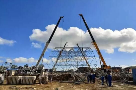 近日,4臺徐工QY25K5-I汽車起重機在印度尼西亞卡巴那島某項目的網(wǎng)架主體進(jìn)行了協(xié)同吊裝。