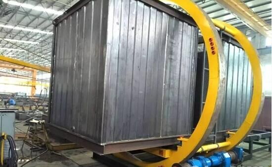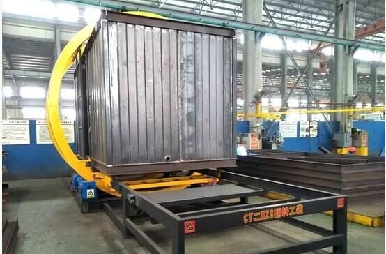 該工裝適用于HZS系列混凝土攪拌站所有水箱、外加劑箱、控制室生產(chǎn)過程中的翻轉(zhuǎn)焊接。工裝工件采用軌道輸送,四角螺旋定位,平穩(wěn)快速;可調(diào)節(jié)過渡軌道,可移動踏板,方便快捷,安全可靠。