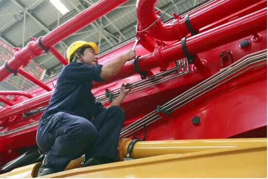 由于泵車生產(chǎn)線是高度柔性化的生產(chǎn),產(chǎn)品型號(hào)有37米、49米、56米、66米、86米等幾十種型號(hào),還要滿足客戶的各種定制化需求,這就要求工人們?cè)谑炀氄莆彰恳豢町a(chǎn)品的標(biāo)準(zhǔn)化作業(yè)同時(shí),牢記每一顆螺母、每一根膠管、每一個(gè)閥塊的正確安裝方法,對(duì)泵車制造工藝做到了然于心,用最快的速度保證每一臺(tái)泵車的順利下線。
