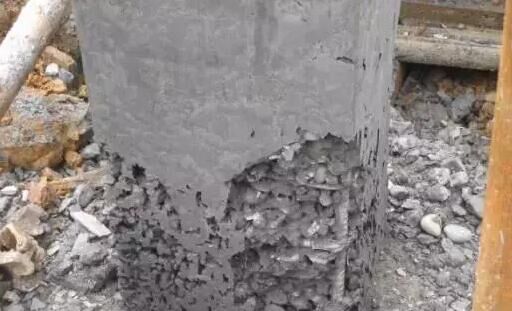 混凝土柱爛根初步處理方案可以采取灌漿法修補,材料使用MEK-40灌漿料,施工流程為:舊混凝土鑿毛→用清水沖洗飽和→灌注、涂抹灌注漿體→養(yǎng)護。
