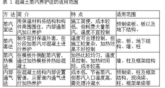 蒸汽法養(yǎng)護(hù)按照不同的加熱方式可以分為蒸汽室法、蒸汽套法、毛管模板法、蒸汽熱模法和內(nèi)部通氣法,其特點(diǎn)及使用的范圍見表 1。