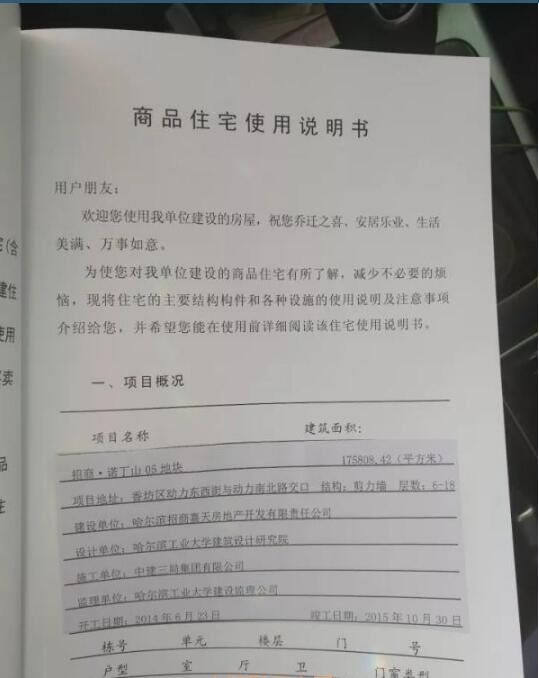 在哈爾濱市城鄉(xiāng)建設委員會官方網站上,記者查到了“招商諾丁山 05 地塊 8#樓”的《哈爾濱市工程竣工驗收備案證》,備案號為黑建備字號2015380,建設單位為哈爾濱招商嘉天房地產開發(fā)有限責任公司,施工單位為中建三局集團有限公司,監(jiān)理單位為哈爾濱工業(yè)大學建設項目管理公司,開竣工日期為2014年6月15日-2015年12月18日,備案日期2015年12月18日。