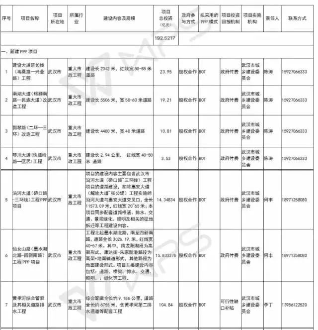 武漢市推15個PPP項目,總投資728.16億元,涵蓋市政道路、人工智能、綜合管廊、城鎮(zhèn)污水處理、產(chǎn)業(yè)園基礎(chǔ)設(shè)施等領(lǐng)域,其中與基建相關(guān)的項目7個,投資192.52億元。
