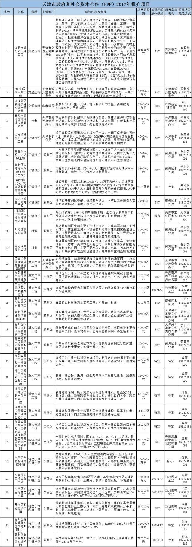 天津市發(fā)改委推介31個PPP項目,總投資1469億元,涉及交通運輸、水利、環(huán)境保護(hù)、林業(yè)、重大市政工程和特色小鎮(zhèn)及棚戶區(qū)六個領(lǐng)域,其中與基建相關(guān)的23個,投資超1438億元。