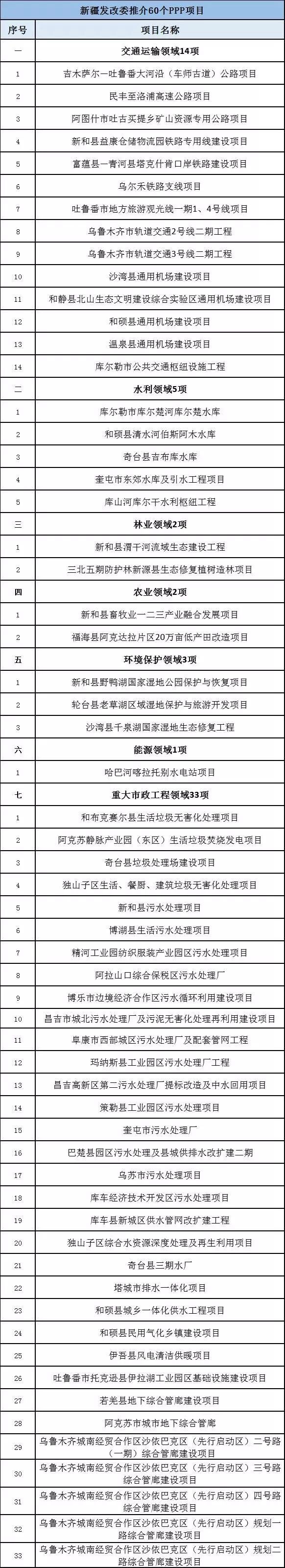 新疆維吾爾自治區(qū)發(fā)改委推介60個PPP項目,總投資559.12億元。包括:交通運輸領(lǐng)域項目14項,總投資368.2億元;水利領(lǐng)域項目5項,總投資40.58億元;林業(yè)領(lǐng)域項目2項,總投資4.6億元;農(nóng)業(yè)領(lǐng)域項目2項,總投資5.3億元;環(huán)境保護(hù)領(lǐng)域項目3項,總投資14.67億元;能源領(lǐng)域項目1項,總投資20.2億元;重大市政工程領(lǐng)域項目33項,總投資105.57億元。