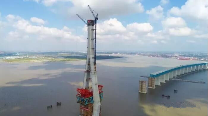 在國內(nèi),大部分橋梁主塔高度都在260米以下,300米以上極其少見,而本次完成施工的大橋北側(cè)主塔,建設整體高達330米,相當于110層高樓,為國內(nèi)最高主塔,同時也是世界公鐵兩用斜拉橋中最高主塔;混凝土澆筑達7.3萬方,鋼筋1.1萬噸,體量也為世界最大。