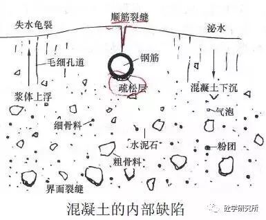 混凝土拌合物在攪拌后混合均勻,骨料下沉,混凝土中的游離水和輕物質(zhì)上浮、氣泡逸出,泌出的水分在混凝土表面聚集,這是混凝土拌合物的保水性(粘聚性)不好,這個(gè)過程會(huì)在混凝土內(nèi)部形成較多的缺陷,如: