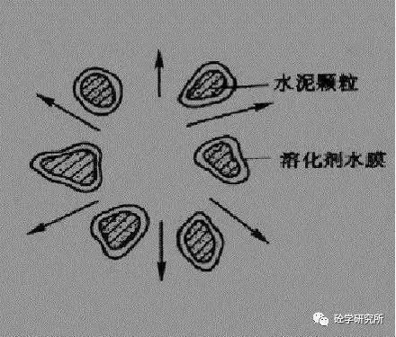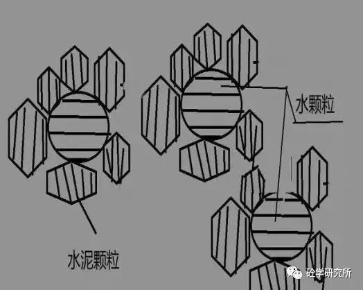 種水泥拌合物狀態(tài)為工地常見狀態(tài),也就是說一個(gè)水顆粒被N多的這個(gè)水泥顆粒包裹著。那么水泥顆粒與水泥顆粒之間有非常大的這個(gè)電子吸附效應(yīng),還有內(nèi)摩角度。這樣同等用水量情況下混凝土看上去比較干燥,并且流動(dòng)性不佳。