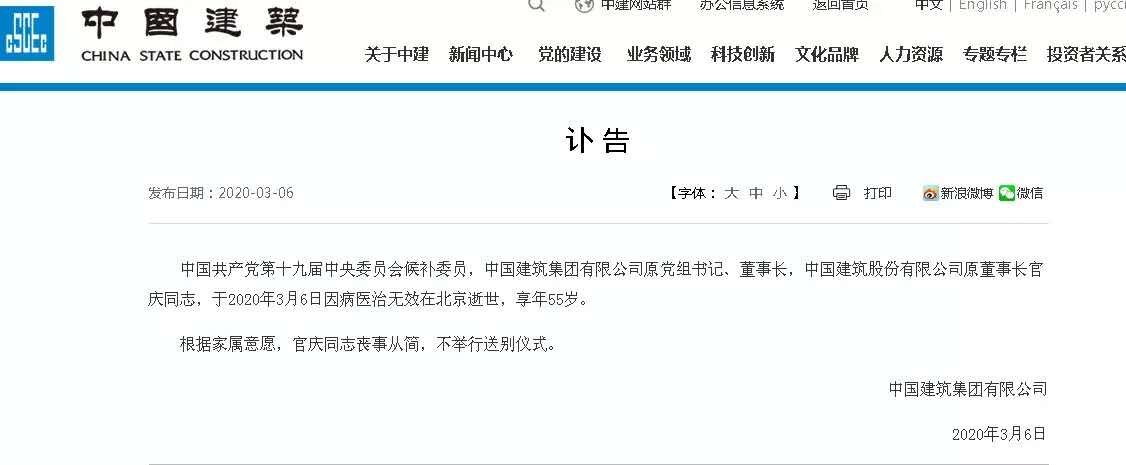 中國共產(chǎn)黨第十九屆中央委員會候補委員,中國建筑集團有限公司原黨組書記、董事長,中國建筑股份有限公司原董事長官慶同志,于2020年3月6日因病醫(yī)治無效在北京逝世,享年55歲。