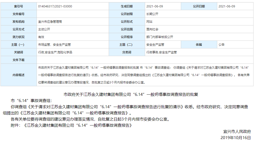 2021年6月9日,江蘇省宜興市人民政府官網(wǎng)發(fā)布《關于江蘇金久建材集團有限公司“6.14”一般坍塌事故調(diào)查報告的批復》,對一起因筒庫坍塌造成2死1傷的事故進行通報。