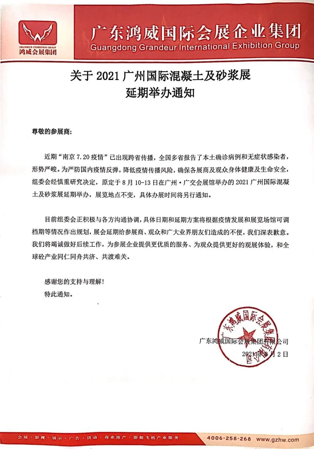 由于當前國內(nèi)多地出現(xiàn)新型冠狀病毒肺炎新增確診病例、中高風險地區(qū)不斷增加的疫情嚴峻形勢影響,為全力配合做好疫情防控工作,避免大規(guī)模聚集和降低疫情傳播風險,保障參展商、觀眾及工作人員健康安全,維護參展單位權(quán)益,確保展會效果,組委會經(jīng)慎重研究決定,原定于8月10-13日在廣州·廣交會展館舉辦的2021廣州國際混凝土及砂漿展延期舉辦,展覽地點不變,具體辦展時間將另行通知。