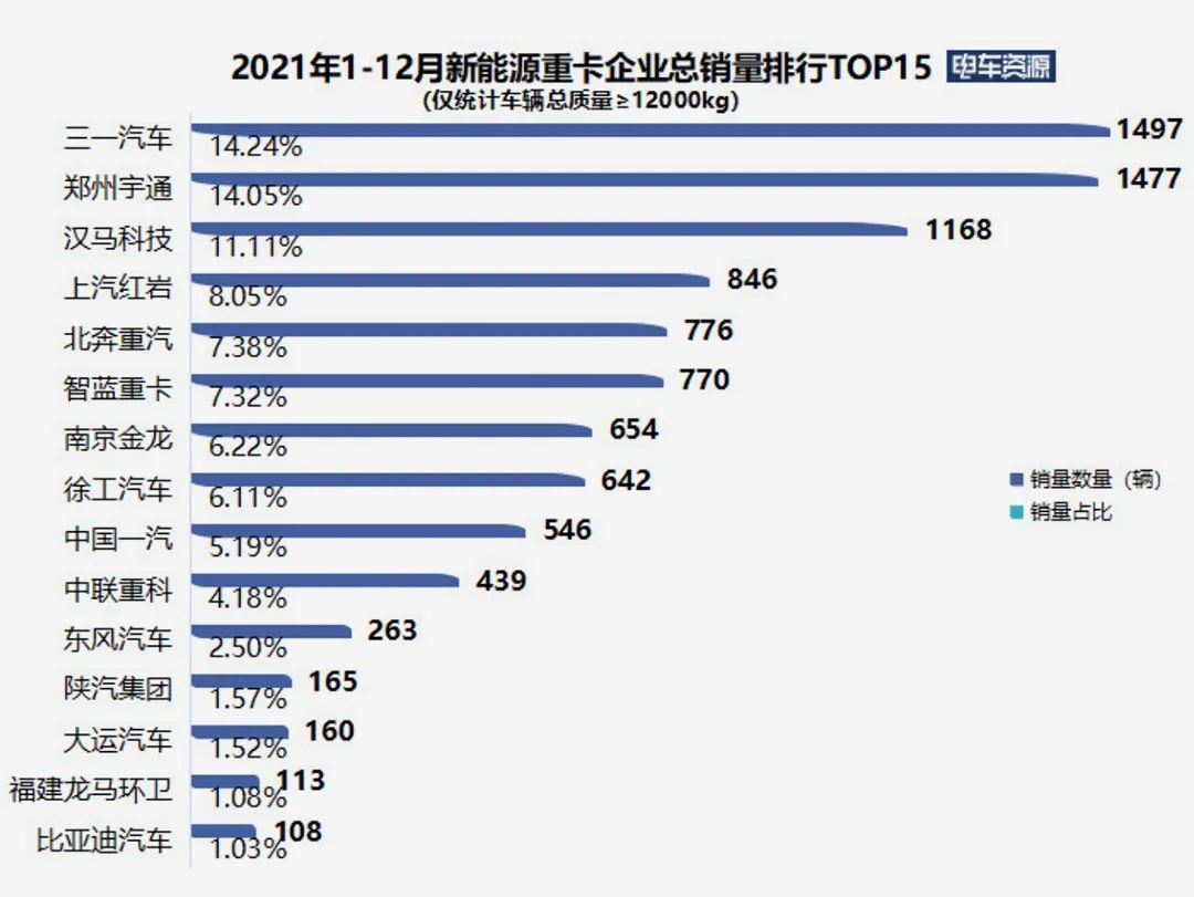 特別是在企業(yè)銷量排行榜上,表現(xiàn)最為搶眼的并不是傳統(tǒng)重卡制造商,而是工程機(jī)械企業(yè)跨行業(yè)進(jìn)軍重卡行業(yè)的典型代表——三一汽車與徐工汽車:三一新能源重卡2021年累計(jì)銷量達(dá)到1497輛,同比大增1621%,市場(chǎng)份額達(dá)到14.33%,較上年同期提升了11個(gè)百分點(diǎn);徐工在2022年1月21.2%的月度占有率火熱開局,問鼎新能源重卡2022首月銷冠。