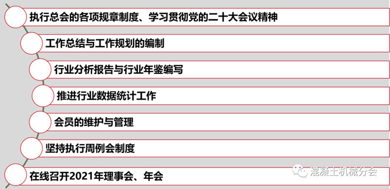 協(xié)會(huì)篇主要內(nèi)容包括:規(guī)劃混凝土機(jī)械行業(yè)發(fā)展戰(zhàn)略與發(fā)展目標(biāo)。不斷加強(qiáng)團(tuán)隊(duì)建設(shè)與組織建設(shè)、服務(wù)會(huì)員企業(yè)、引導(dǎo)行業(yè)解決卡脖子問(wèn)題、維護(hù)行業(yè)發(fā)展秩序、打造行業(yè)上下游全產(chǎn)業(yè)鏈緊密聯(lián)動(dòng)的行業(yè)協(xié)會(huì),加速推進(jìn)國(guó)產(chǎn)化進(jìn)程,推動(dòng)行業(yè)高標(biāo)準(zhǔn)、高質(zhì)量發(fā)展。