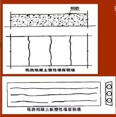 1塑性塌落裂縫塑性塌落裂縫,一般多發(fā)生在混凝土澆注過程或澆注成型后、混凝土初凝前發(fā)生,由于混凝土拌合物中的骨料在自重作用下緩慢下沉,水向上浮,即所謂的泌水,若是素混凝土,混凝土內(nèi)部下沉是均勻的,若是鋼筋混凝土,則混凝土沿鋼筋下方繼續(xù)下沉,鋼筋上面的混凝土被鋼筋支頂,使混凝土沿鋼筋表面產(chǎn)生順筋裂縫。大流動性混凝土或水灰比較大的混凝土塑性塌落裂縫問題尤為嚴(yán)重。