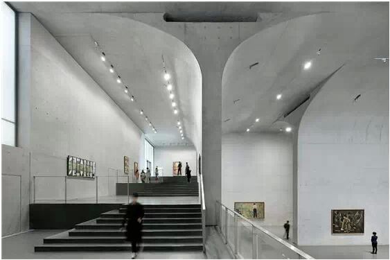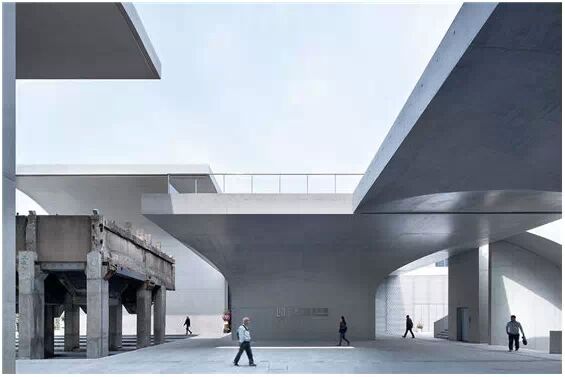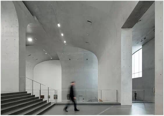 在“傘拱”結(jié)構(gòu)的空腔里,地面以上的“傘拱”覆蓋空間,墻體和天花均為清水混凝土的表面,它們的幾何分界位置也變得模糊。這樣的結(jié)構(gòu)性空間,在形態(tài)上不僅對人的身體形成庇護(hù)感,亦與保留的江邊碼頭的煤料斗產(chǎn)生視覺呼應(yīng)。建筑的內(nèi)部空間也得以呈現(xiàn)一種原始的野性魅力,而有著大小調(diào)節(jié)的空間尺度以及留有模板拼縫和螺栓孔的清水混凝土表面又會帶來一種現(xiàn)實(shí)感。這種“直白”式的結(jié)構(gòu)、材料、空間所形成的直接性與樸素性,加上大尺度出挑所產(chǎn)生的力量感或輕盈感,使整個(gè)建筑與原有場地的工業(yè)特質(zhì)間取得一種時(shí)間與空間的接續(xù)關(guān)系。地面以上的清水混凝土“傘拱”下的流動(dòng)展覽空間和地下一層傳統(tǒng)“白盒子”式的展覽空間由一個(gè)呈螺旋回轉(zhuǎn)、層層跌落的階梯空間聯(lián)接,既原始又現(xiàn)實(shí)的空間和古代、近代、現(xiàn)代直到當(dāng)代藝術(shù)的展覽陳列,這種并置的張力,呈現(xiàn)出一種具有時(shí)間性的展覽空間。