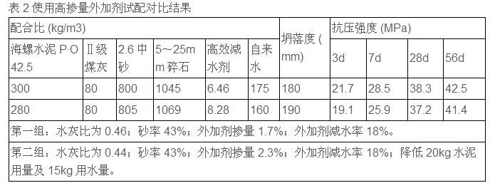 試配對(duì)比結(jié)果分析:其他材料相同,使用高效減水劑(NF-1),保持砂率及外加劑摻量不變,適當(dāng)降低水泥用量及用水量,使水灰比降低,在相同的坍落度下28d 及 56d 強(qiáng)度相近并降低了成本。