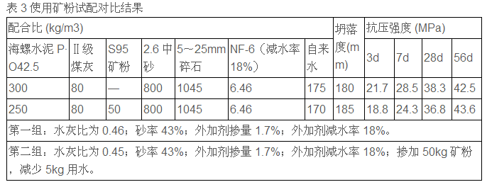 磨細(xì)礦粉能延緩膠凝材料的水化速度,延長(zhǎng)凝結(jié)時(shí)間,尤其在炎熱的夏季及大體積混凝土應(yīng)用中有明顯效果。另外礦粉具有改善混凝土工作性,改善混凝土的內(nèi)部結(jié)構(gòu),提高抗?jié)B和抗腐蝕的能力,這些都有大量試驗(yàn)證明。因?yàn)樗嗯c礦粉存在部分差價(jià),利用礦粉后期增強(qiáng)效果,既可以降低水化熱,減少裂縫的產(chǎn)生,又可以使混凝土后期強(qiáng)度不變或更高。如表3。
