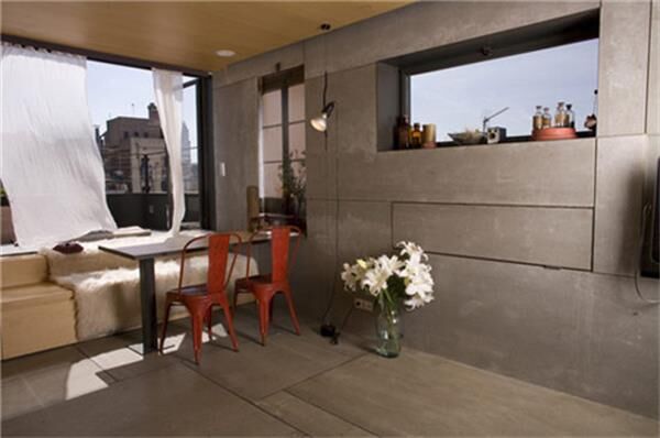 床的亮點(diǎn)設(shè)計(jì)在于它是可以伸縮的。白天可以推進(jìn)去,這里充當(dāng)飄窗的作用。墻面也是頗有創(chuàng)意和實(shí)用性,隱藏在墻上的混凝土板,拉下來變成方便的書桌或是餐桌。