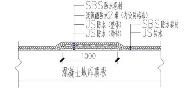 頂板混凝土養(yǎng)護(hù)后,冷縫處混凝土加強(qiáng)處理,設(shè)置防水附加層,為了保障地庫(kù)頂板防水效果,現(xiàn)場(chǎng)在冷縫處1m范圍進(jìn)行防水附加層,具體做法如下:
