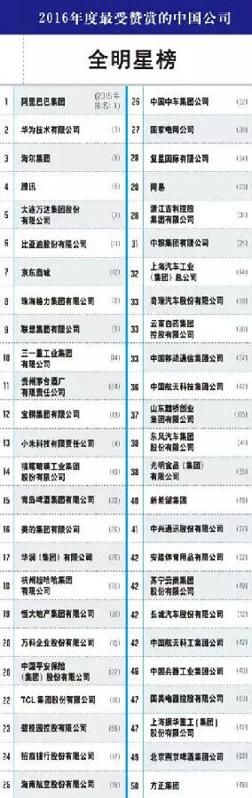 這份榜單一向被認(rèn)為是中國公司軟實(shí)力的晴雨表,今年的排行榜由《財(cái)富》(中文版)通過網(wǎng)絡(luò)向35000名中國企業(yè)管理人發(fā)放問卷調(diào)查得出。調(diào)查評(píng)分標(biāo)準(zhǔn)主要包括產(chǎn)品和服務(wù)地位、長(zhǎng)期投資價(jià)值、公司資產(chǎn)合理利用、創(chuàng)新能力、管理質(zhì)量、財(cái)務(wù)穩(wěn)健程度、吸引和保留人才的能力、社會(huì)責(zé)任、全球化經(jīng)營的有效性9個(gè)方面,綜合得分最高的50家公司榮登“最受贊賞的中國公司”全明星榜。