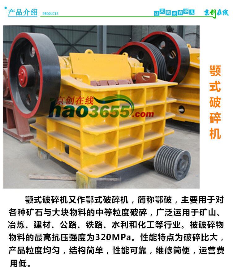 顎式破碎機(jī)在礦山、建材、基建等部門主要用作粗碎機(jī)和中碎機(jī)。按照進(jìn)料口寬度大小來分為大、中、小型三種,進(jìn)料口寬度大于600MM的為大型機(jī)器,進(jìn)料口寬度在300-600MM的為中型機(jī),進(jìn)料口寬度小于300MM的為小型機(jī)。顎式破碎機(jī)結(jié)構(gòu)簡(jiǎn)單,制造容易,工作可靠,使用維修方便。
