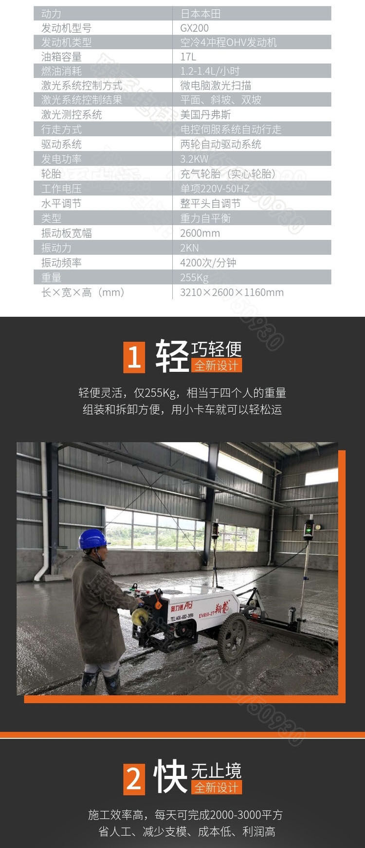 一、減少人力成本,翻倍提高效率:傳統(tǒng)工藝施工人數(shù)較多,需要支模板(槽鋼)、打點、攤鋪。需要人力20人左右。每天施工面積在700平方。采用混凝土激光整平機(jī)總?cè)藬?shù)比傳統(tǒng)工藝減少一多半??蓡稳瞬僮?。每天施工面積在2500平---3500平,大大降低了人力成本。