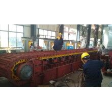 鏈板全部采用16Mn鋼板制作,厚度16-25mm。采用單圓弧搭接結(jié)構(gòu)形式,工作時始終處于相互搭接狀態(tài),抗沖擊、耐磨損、鏈板之間不漏料,安全可靠。每個鏈板兩側(cè)邊采用導向板定位,