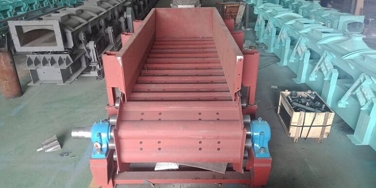 通過分析研究上述問題,結(jié)合國內(nèi)外給料機(jī)使用情況,重新設(shè)計(jì)制作了一臺(tái)新型給料機(jī),主要特點(diǎn)是:采用板式給料機(jī)連續(xù)給料;板式給料機(jī)料板采用雙圓弧、節(jié)點(diǎn)重合的方式,解決了漏料問題;板式給料機(jī)安裝角度為18°,可使物料緩慢分散跌落到皮帶機(jī)上;撥料棍采用逆物料方向旋轉(zhuǎn),以控制物料層的厚度;料斗設(shè)計(jì)采用漸開式,解決了膨料問題;電機(jī)采用變頻控制,可控制出料速度。經(jīng)過三個(gè)多月的的現(xiàn)場使用,證明能夠完成勻料,效果較好。
