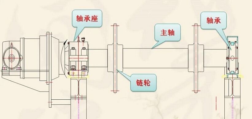 該裝置主要由軸、鏈輪、支承輥等件組成。兩端支撐為滾動軸承,主軸與減速器、空心軸套裝在一起,通過鎖緊盤將其二者連接到一起,達(dá)到傳遞扭矩的要求,結(jié)構(gòu)緊湊。