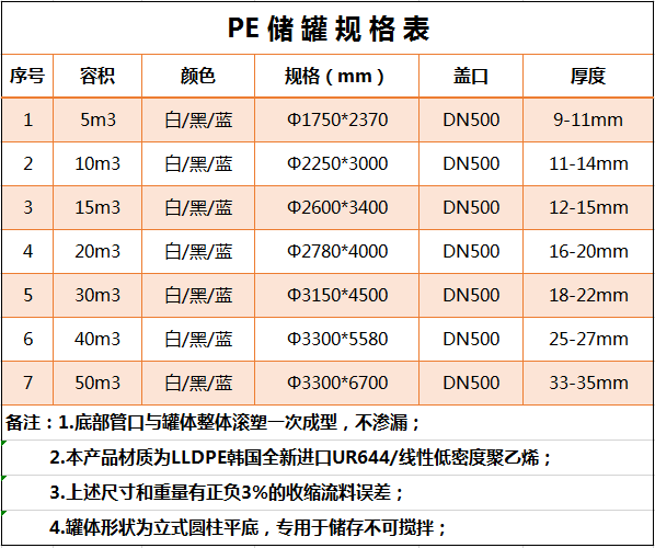 所用材質(zhì)為韓國(guó)進(jìn)口聚乙烯(PE)滾塑原料,儲(chǔ)罐一次成型,內(nèi)外光滑,具有良好的衛(wèi)生性與抗紫外線能力,耐酸堿、耐腐蝕、易清洗、不易老化。它可以盛裝在常溫下無(wú)機(jī)酸、堿、鹽等大部分物質(zhì)及有機(jī)物,耐熱耐凍 耐熱耐凍性佳,-5℃—+85℃均可使用