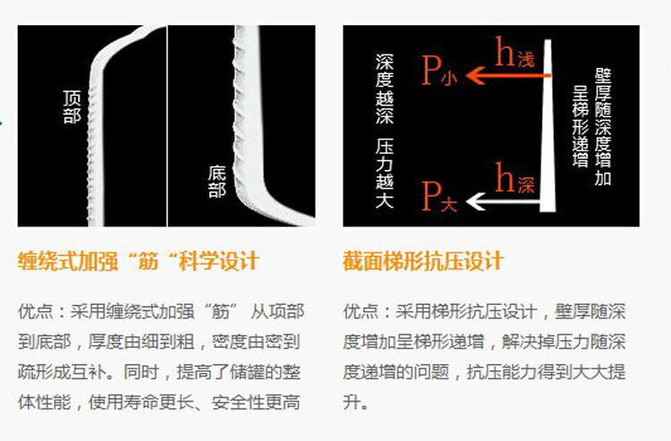 1)產(chǎn)品采用韓國進(jìn)口高質(zhì)量LLDPE作為產(chǎn)品生產(chǎn)原材料,生產(chǎn)出來的pe儲罐具有無毒、無味、耐酸、耐堿、耐沖擊、耐高溫、耐寒、不易老化等優(yōu)點(diǎn)。