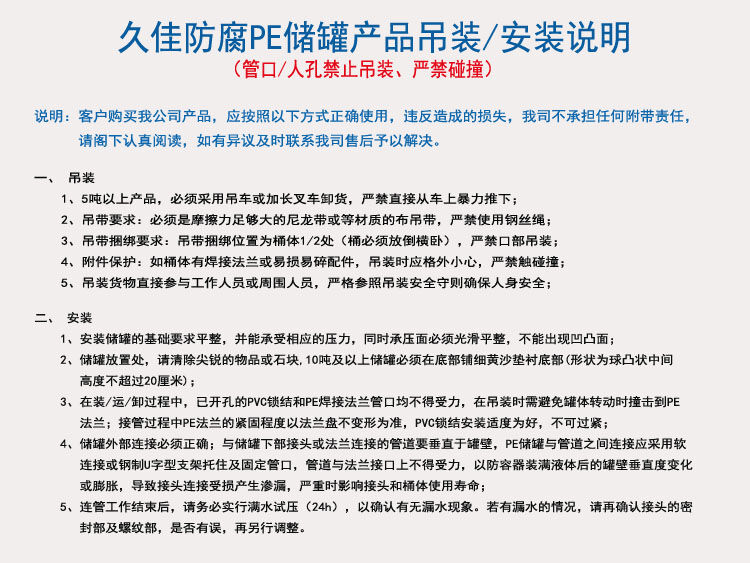 久佳防腐是華南一家堅持使用韓國644全新PE料的企業(yè),也是華南堅持采用底部出料管口整體一次成型的企業(yè),主要產(chǎn)品有:聚乙烯儲罐、鹽酸儲罐、塑料儲罐、減水劑儲罐、外加劑儲罐、鋼襯塑儲罐、不銹鋼儲罐、碳鋼儲罐、鋼襯塑攪拌罐、鋼襯塑反應(yīng)罐、離子交換柱等產(chǎn)品;具有無焊接縫、不滲漏、無毒性、重量輕、抗老化、抗沖擊、耐腐蝕、壽命長等特性。