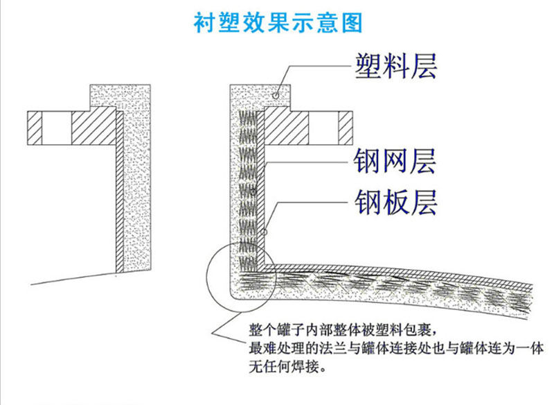 鋼襯塑產(chǎn)品一般由桶身、平底、封頂、人孔、進(jìn)料口法蘭、出料口法蘭和液位孔口法蘭組成,臥室鋼襯塑儲罐通常還有標(biāo)準(zhǔn)鋼質(zhì)支座,鋼襯塑產(chǎn)品一般根據(jù)用戶要求設(shè)計制造。