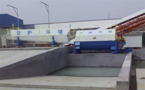 該系統(tǒng)主要由:攪拌車加水清洗裝置,溜槽輸送裝置,砂石漿水分離裝置,和泥漿水后處理裝置組成。混凝土輸送設(shè)備清洗后,將殘余混凝土排入溜槽中,在高壓水流沖擊下,經(jīng)溜槽進入砂石分離機,在不斷旋轉(zhuǎn)的分離機作用下,對混凝土進行充分的清洗,同時將砂、石進行分離,分離后的砂、石在導(dǎo)料葉片的作用下背向流動,再通過提升式出料口排出分離機,分別堆放。清洗后的漿水從分離機的底部排出進入沉淀池逐級沉淀后循環(huán)使用或進入攪拌池回收利用。進入攪拌池(一般情況2個攪拌池)的漿水為了防止沉淀凝固,需通過攪拌器的作用,攪拌器的工作為間歇式。分離出水泥漿在連續(xù)的攪拌器作用下,再通過高壓污水泵輸送到攪拌樓中待生產(chǎn)計量再利用。整個控制系統(tǒng)設(shè)有手動和自動控制,方便控制設(shè)置,整個系統(tǒng)運行可靠,故障率低,維護量少等特點。