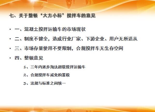 隨后,會(huì)長(zhǎng)分析了攪拌車(chē)的市場(chǎng)現(xiàn)狀,制度不健全,造成行業(yè)廠(chǎng)家、下游企業(yè)、用戶(hù)無(wú)所適從,市場(chǎng)存量使用不受限制,合規(guī)攪拌車(chē)無(wú)生存空間;同時(shí)提出了建設(shè)性的整頓意見(jiàn)。