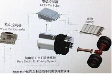 動力總成采用電驅動機械式自動變速器,采用四檔自動變速傳動,無離合器,無機械式同步器,利用電驅動主動同步代替?zhèn)鹘y(tǒng)的同步器摩擦被動同步,純EMT相比傳統(tǒng)自動變速器AMT具有高效率和低成本優(yōu)勢。